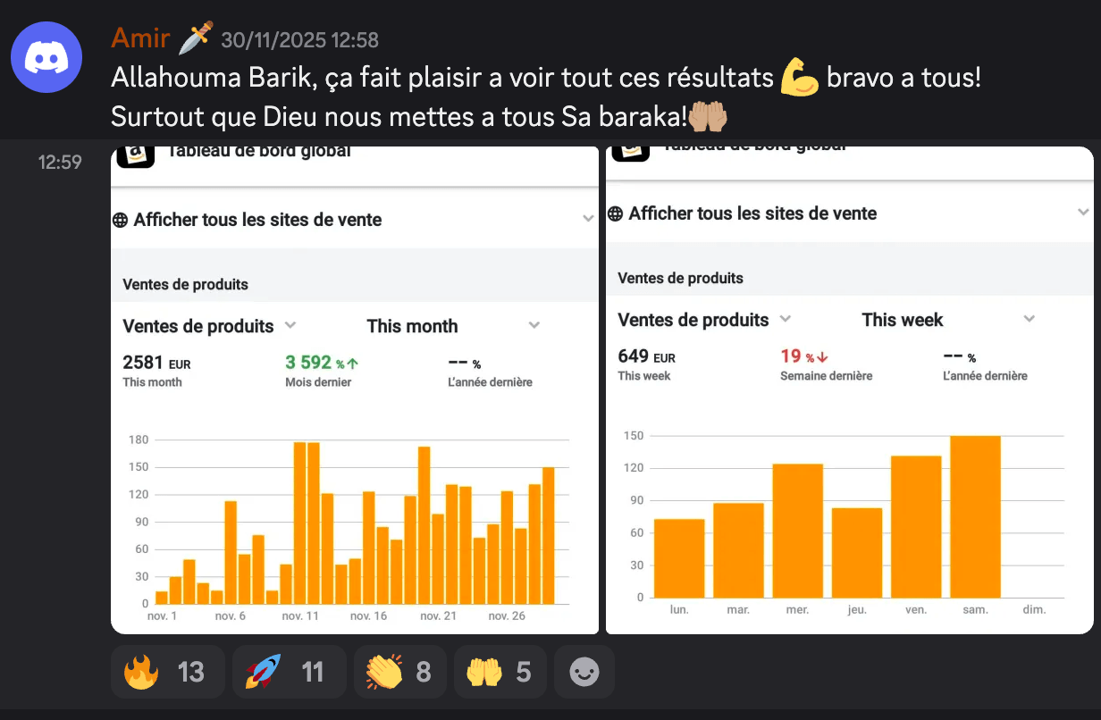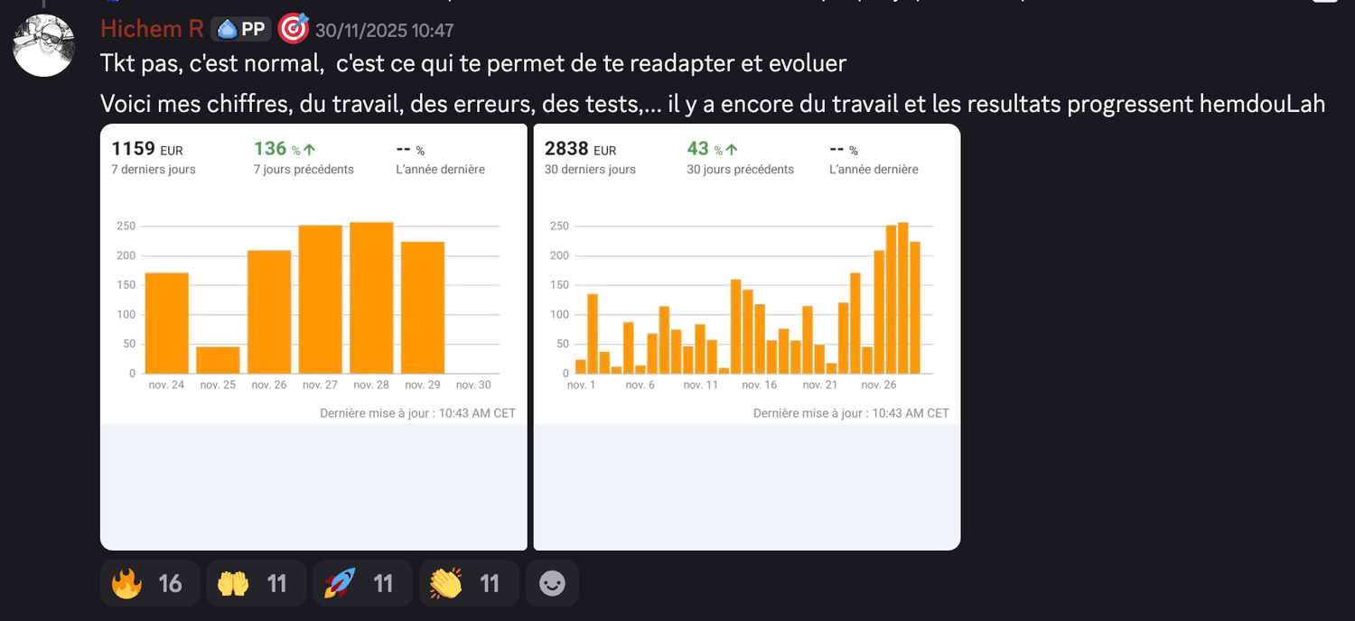 Ça dépend de ton implication. Avec 1-2h par jour, tu peux faire tes premières ventes en 2-4 semaines. Certains membres le font en parallèle de leur travail, d'autres à temps plein.